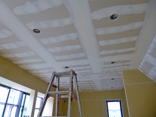 天井は、プラスターボードの継ぎ目などの処理が終わり、これから塗装を塗ります。