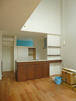 キッチンの入り口には、猫が入らなくするための隠し扉を付けています。ダイニングのテーブル上のペンダント照明は、作業の邪魔になるので、なるべく後に取付けます。
