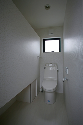 寝室と2階トイレの入り口扉には、猫用の出入り口が付いています。2階トイレには猫用のトイレも置き、グッズも納めます。ここの猫は蛇口から流れる水を飲む習慣があるので、トイレにはあえて手洗い付きの器具を入れています。とってもシャイな猫も早くここを気に入ってくれると良いのですが。