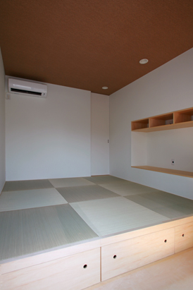 [左]主寝室は小上がりとなっていて、手前側は収納としている。奥の引き戸の向うはウォークインクローゼット。