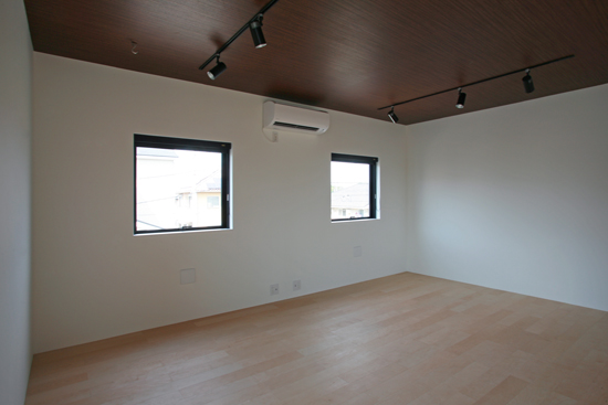 将来、2室の子供室に仕切ることができるファミリールーム。床は明るい色合いのバーチ複合フローリング、天井は暗めの色に抑えている。右の奥には納戸がある。