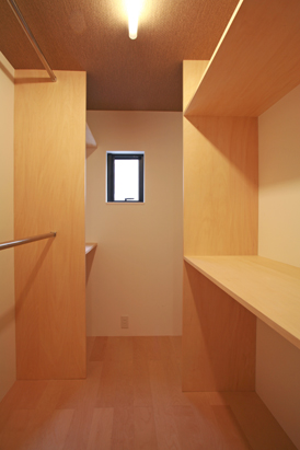 [右]棚とハンガーパイプを造付けたウォークインクローゼット。