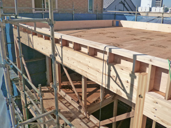 屋上テラス。床構造用合板の上にこれから断熱材を敷き、その上に下地を組んで防水していきます。