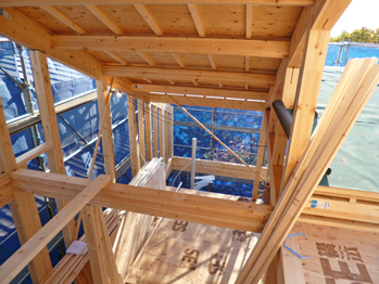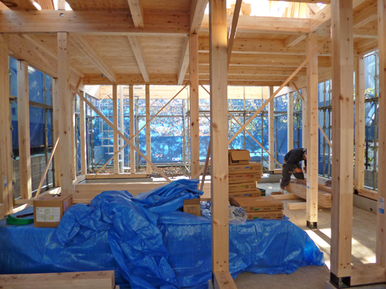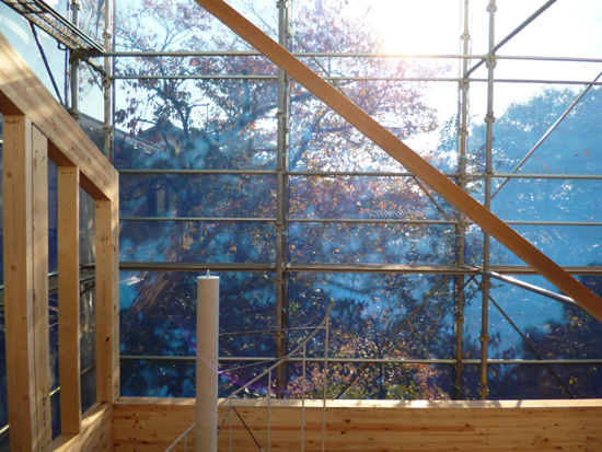 先週、上棟した『緑あふれるアトリエのある家』(木造2階建て(SE構法))。南側に広がる隣地の樹々の葉が色付きはじめ、急に現場が秋めいてきました。