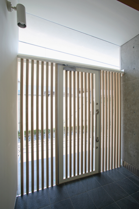 アプローチの先には、敷地内から移植した侘助(わびすけ)が見えます。