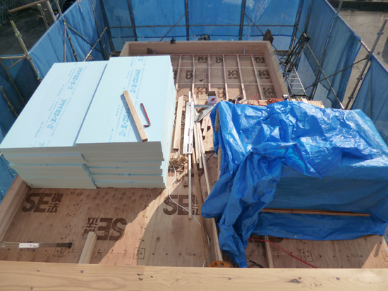 2階のベランダは勾配付きの木下地が作られました。ここに断熱材厚65mm、合板厚15mm×2枚張り、FRP防水で仕上げられます。