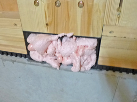 [左]床合板の釘ピッチの確認。床がなくなる吹抜やユニットバス廻りは、一定の範囲まで釘ピッチを75mmで施工します。[右]スチール製のSE構法の柱脚金物は、熱橋となる部分なので、断熱材を吹き込んでその影響を最小限に抑えます。
