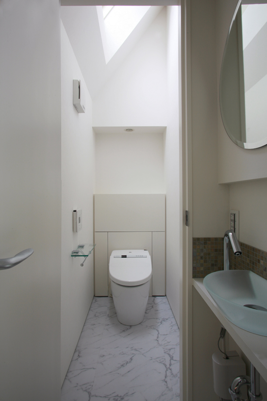 LDKから少し距離を取って中間階に設けた、トイレと手洗いコーナー。トップライト(電動開閉式)から光が降りてきます。便器の後ろには掃除道具やトイレットペーパーなどを収納する家具を造作。正面の壁にかける額やカウンター上を照らせるように、上部に照明を仕込んでいます。
