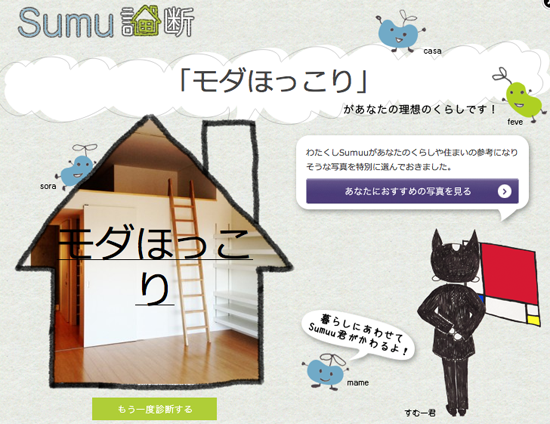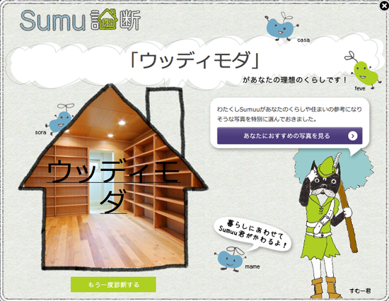 設計事務所アーキプレイスでもフェブカーサのfevecasa(フェブカーサ)のsumu(スムー)診断してみたところ、私(石井)は「ウッディモダ」、近藤は「モダほっこり」との診断結果でした。執事のsumu(スムー)が20種類以上のキャラを見せてくれて、自分の好みを直感的に診断できるSumu診断、漠然と感じていた自分の好みの空間イメージを絞り込んでいくのに役立ちそうです。