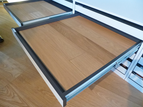 ショールームでは60センチ角の大きな面で3種類のフローリングを見比べて、木目の入り方、色や風合いを確認して、オークの複合フローリング(幅120、突き板2mm、オスモ塗装品)に決まりました。