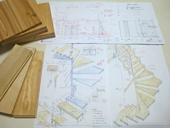 2〜3階への階段は鉄骨造のストリップ階段で、足が載る部分(踏み板)には木を載せる形で検討してきました。上がり下りのし易さ、無駄のない幅、安全性、シンプルなデザインのほか、「踏み板の側面が見えたデザイン」にしたいとの要望があり。年越しで頭を悩ませてきましたが、一つアイデアを思いつきスケッチを描きました。建て主の方にも気に入ってもらえたようで、さらに、建て主の方のアイデアを加えて、なかなかキレイな階段が生まれそうです。