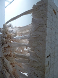 上は、白い古着を数千枚使ったオブジェ。(吉本直子Yoshimoto Naoko)白いシャツに生きる過程で生じた「染み」を、命の痕跡・時間の痕跡として、壁面や立体的なオブジェとして展示したものです。