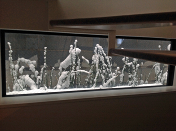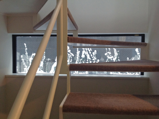 そんな中、昨年(2013)10月に竣工・お引き渡した『ひかりを組み込む家』の建て主の方から「階段室からの雪景色」と題する写真が送られてきました。階段の上がり下りに外が見えるように設けた横長窓。普段は緑色のトクサが綺麗に見えています。そして大雪の日、雪で化粧されたトクサは、白く柔らかな綿菓子のようで、ここにも見たことのない景色が生まれていました。