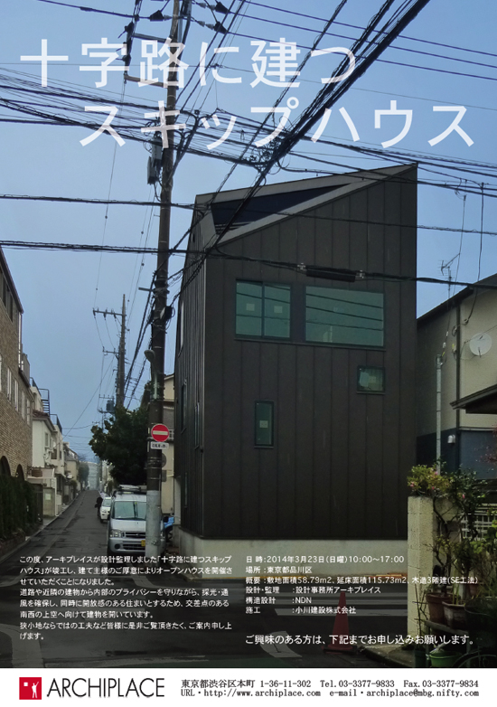 このたび、アーキプレイスで設計監理を進めてきました『十字路に建つスキップハウス』(木造3階建・SE構法)が竣工をむかえ、建て主様のご厚意によりオープンハウスを開催させていただくことになりました。