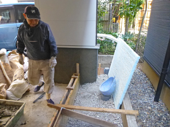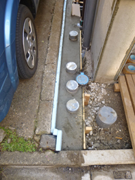 外構工事が始まっています。床に埋め込まれる雨水や汚水の排水用の桝、水道の止水栓やメーターボックスもセットされました。狭小敷地では、配管を通せるスペースも限られるため、こんなところも混雑します。