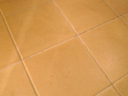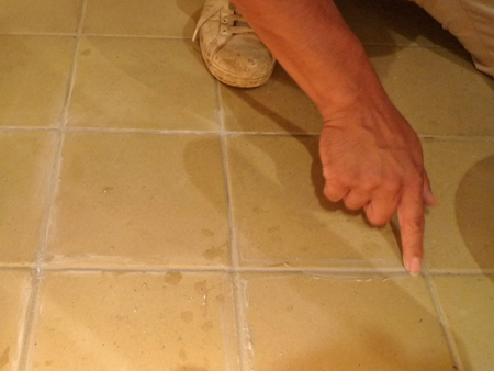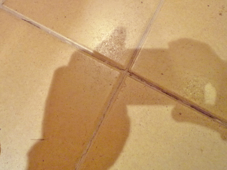 エントランスに貼ったタイル目地の一部剥がれているところは、色合わせした目地材を指で塗り込んだあと、濡れた布で拭き取り補修しました。
