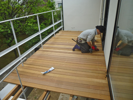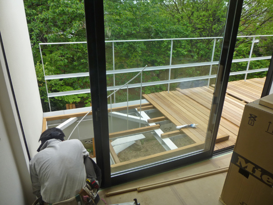 デッキテラスのデッキ材も施工中。想像以上に隣の緑がキレイで、建て主の方も喜んでおられました。