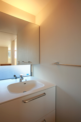 [左]2階トイレ横の洗面スペース。人造大理石の洗面器一体型カウンター。