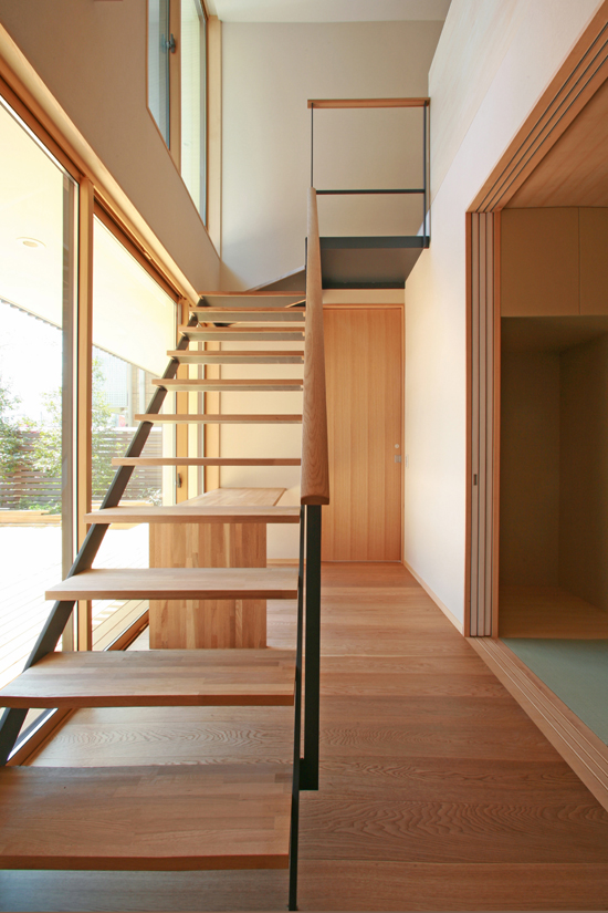 2階への階段は吹抜の中を上がっていきます。階段下にはワークスペース、右には和室がある。