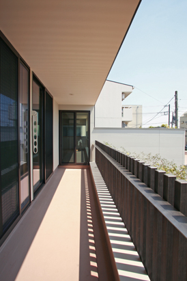 [右]屋根のかかるベランダ。手すりは人工木材のタテ格子。