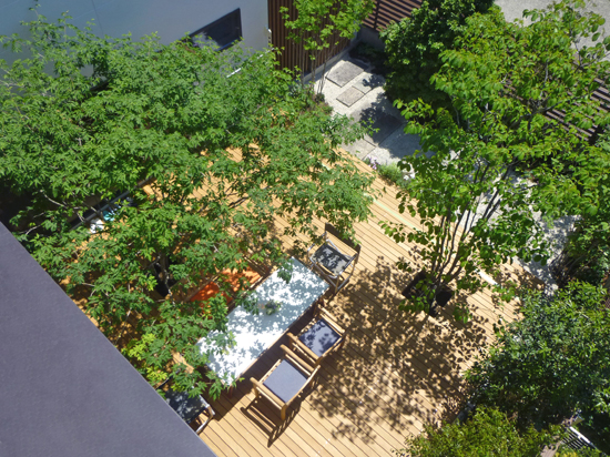 コート(庭)を屋上から見下ろす。テーブル周りにシンボルツリーが木陰を作る。