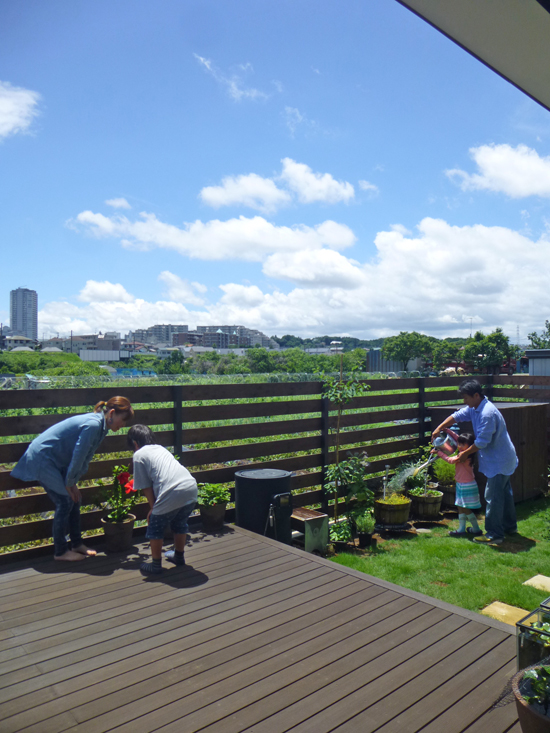 建て主の方が徐々に整備されてきた庭(デッキ、板塀、芝生など)の緑が、青空に映えます。
