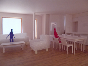 ワークスペースからLDKを見る。床は三層ナラ無垢フローリング。