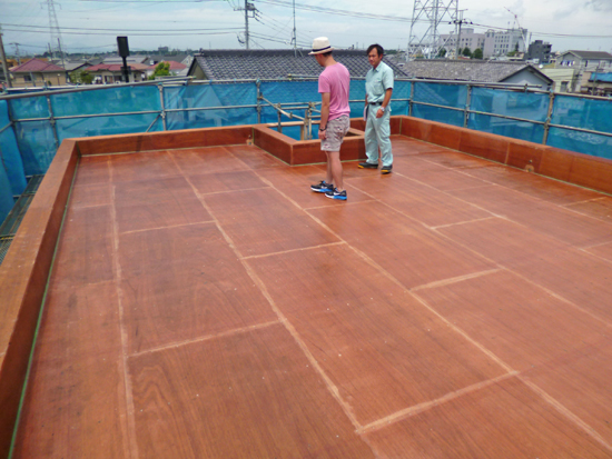 屋根は、台風(11号)が来る前にFRP防水が終わり、下地を濡らさずに済みました。建て主の方も、初めて屋根の上に登られました。