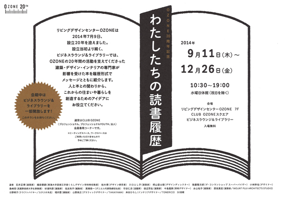 20周年を迎えるリビングデザインセンターOZONEの特別企画のひとつ「わたしたちの読書履歴」展に、設計事務所アーキプレイス/石井正博のお勧め書籍もメッセージ入りで展示されています。