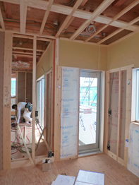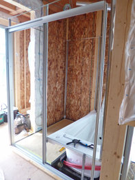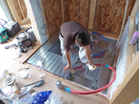 一日掛かりでユニットバス(システムバスルーム)が組み立てられます。ユニットバスの床を支えるスチールの脚は、コンクリートの耐圧版の上に貼った断熱材をくり抜いて固定。くり抜いた部分は断熱欠損にならないように、発泡ウレタンで穴埋めします。ユニットバスの壁や天井のパネルを取り付けるスチールのフレームは、出来上がったら見えなくなりますが、とても華奢に見えます。バスルーム入り口の引戸のフレームも取付けられました。