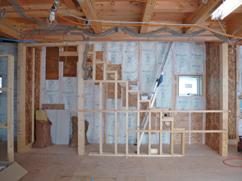 2階の天井下地組ができました。屋根と天井の断熱は、屋根の外側で一旦ポリスチレンホームで断熱し、屋根の内側の天井面にグラスウールの断熱材(アクリア)を付加して二重に行なう仕様です。