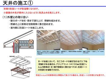 天井の石膏ボードのすべての継ぎ目には野縁を入れるので、天井には防湿フィルムを貼らなくてよい方法。(III~IV(東京)の地域の場合)