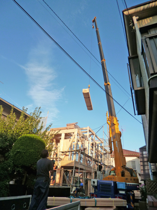 敷地は引込み道路の先にあるため、狭い中での吊り込みになります。