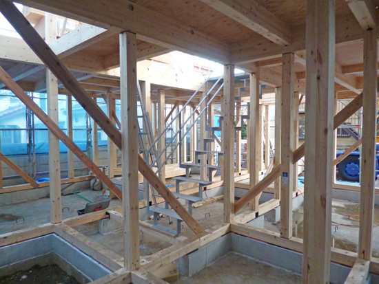 1階ホールの鉄骨階段は、後からでは取り付けにくくなるため、先に設置しました。