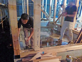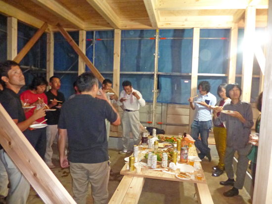 四隅の柱をお清めして簡素に上棟式を行ない、みんなで工事の安全と建物の無事を祈願しました。その後、建て主の方に用意していただいた、お酒とお料理を頂きながらながら歓談。直会(なおらい)をすることは少なくなってきていますが、実際に工事に携わる職人さん達と一緒の機会を持てるのはなかなか良いものです。 Nさん、ご馳走さまでした&ありがとうございました。工事関係者の皆さん、お疲れさまでした&完成に向けて頑張りましょう。