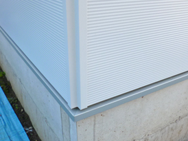 [左]ガルバ同士の出隅役物。既製品を使わず、ガルバサイディングと同材のガルバで加工して製作。とてもキレイにできました。