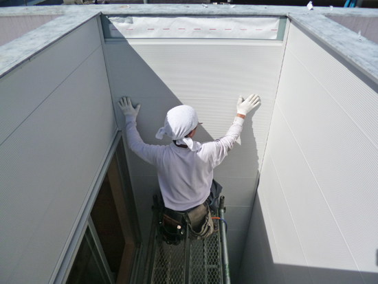 ガルバサイディングの外壁材を坪庭部分にも施工中。後もう少し。