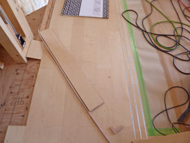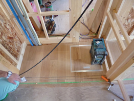 [右]2階のフローリング(バーチ)を貼り始めました。将来用の建具のVレール(床埋め込み)も取付けられています。