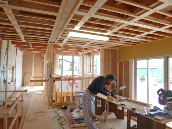 大工さんがフローリングを加工中。2階の天井下地(野縁)が施工されました。