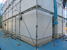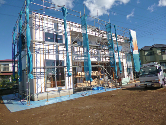 台風の前に養生シートを畳んだので、久々に外観が現れました。これからこの南面の外壁左官工事が始まります。