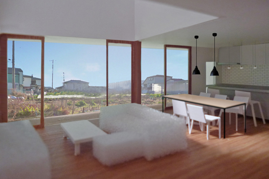 キッチン背面の吊り戸棚の素材と色を、部屋全体(インテリア全体)のなかで再検討できるように、室内パースを作って決定しました。