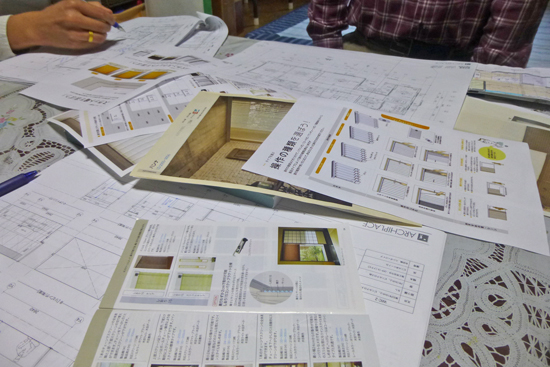 あらかじめ検討されていた、障子やプリーツスクリーンについても打ち合せ。造作家具や収納の作り方は、現在の持ち物の量や収納方法を改めて確認しながら打合せました。