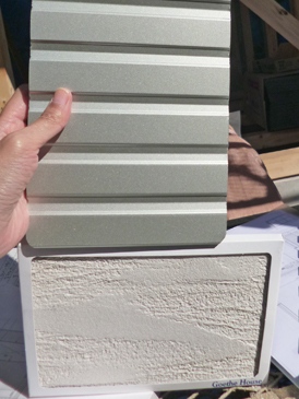 ラインの入ったガルバサイディングの外壁の色は、左官の色とのコントラストを抑えたゲーテハウスに決定。 ガルバサイディングの外壁を縦張りにするか横張りにするかは、もう少し検討して決めることになりました。