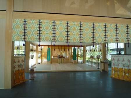 本殿の外周はガラス張りで、外の光がふんだんに入り、調度品もとても美しい。(西日のあたる室内の暑さがちょっと心配に・・・)