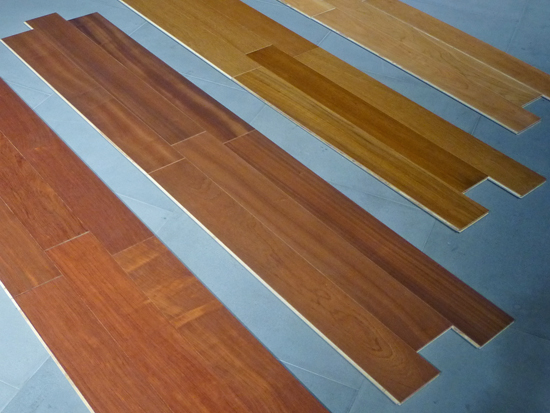 候補になっているフローリング。手前から、ブビンガ、サペリ、チーク、チェリー
