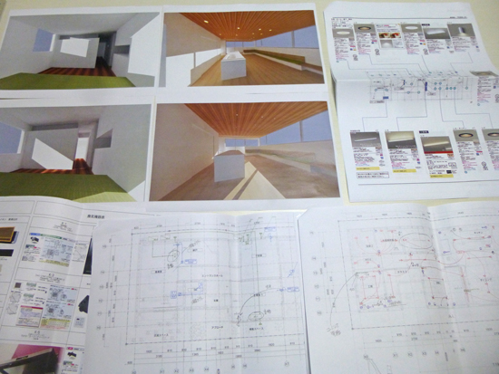 エアコンや換気扇の位置、吸気口の位置や考え方をご説明。電気設備では、照明器具の種類や位置、スイッチやコンセントの位置と数、LANやテレビ配線の位置などを打ち合せしますが、照明では、LED照明や人感センサーによるON-OFFなど普及により、打ち合せることは盛り沢山です。