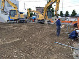 9月から10月わたり、約3週間かけて既存建物(鉄骨造2階建・外壁ALC)を解体。地中にある既存建物の基礎は解体撤去し、杭は新しい基礎と干渉する部分のみ解体しました。