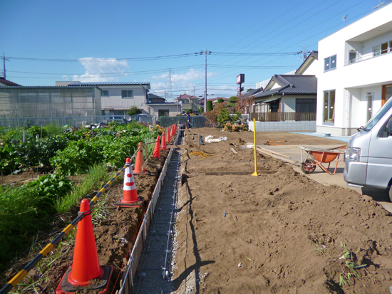 南側の敷地境界には、畑の土が庭に入らないように、CB(コンクリートブロック)2段程の立上りをつけ、その上に亜鉛メッキのネットフェンスを設置します。