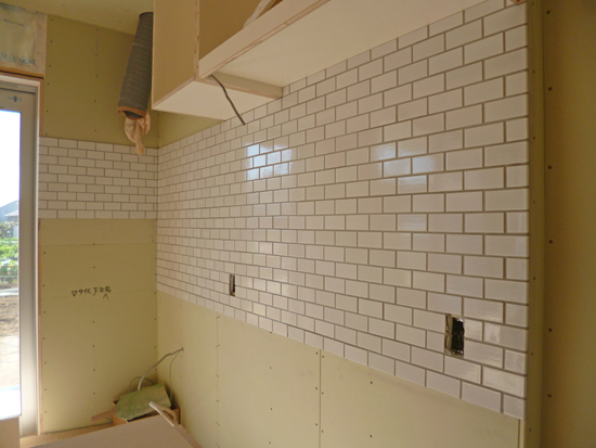 キッチンの背面カウンター前にタイルが貼られました。芋目地で貼った磁器質タイル。