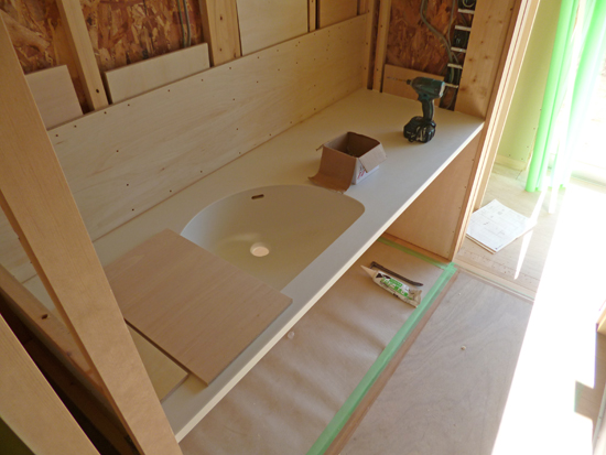 デュポンコーリアン(Dupont CORIAN)のシンクの一体型の洗面カウンターが取付けられました。洗髪できそうだと建て主の方もお喜びでした。